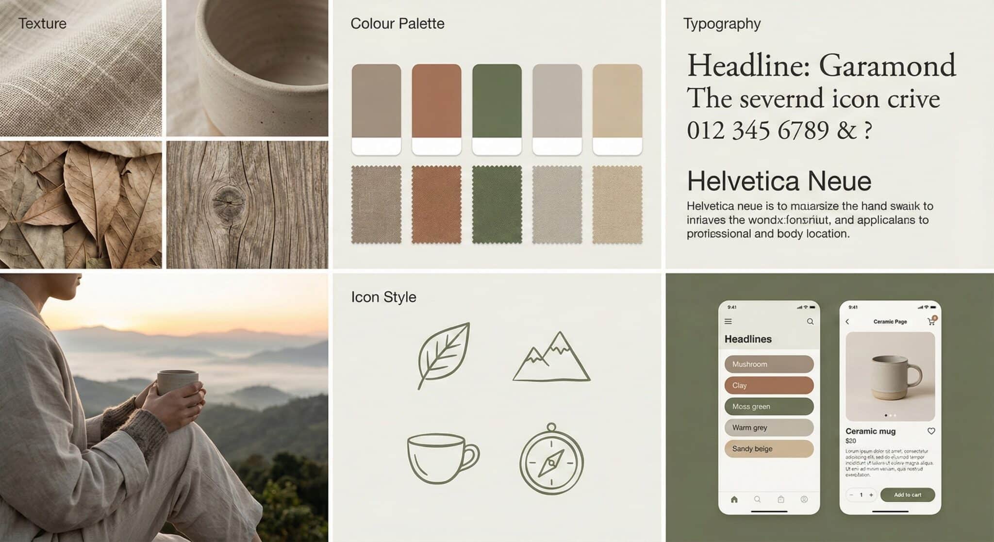 Aesthetic brand mood board with 6 panels: texture, colour palette, typography, lifestyle photo, icon style, and UI sample. Muted earthy tones.