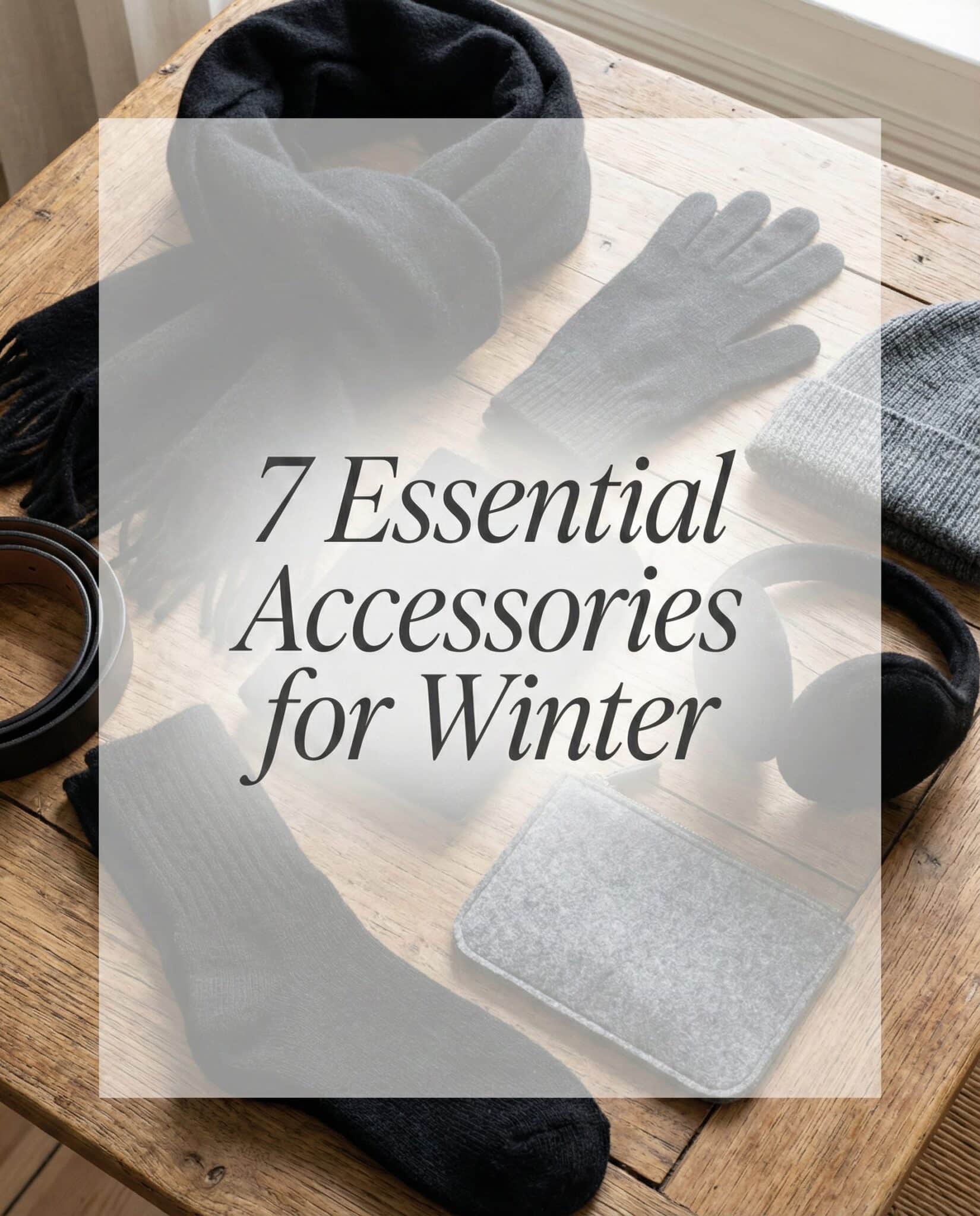 Instagram carousel cover, 4:5 format. Photorealistic flat-lay of winter clothes in a black and grey palette on a wooden table. Subtle white overlay with dark decorative font text reading ‘7 Essential Accessories for Winter’