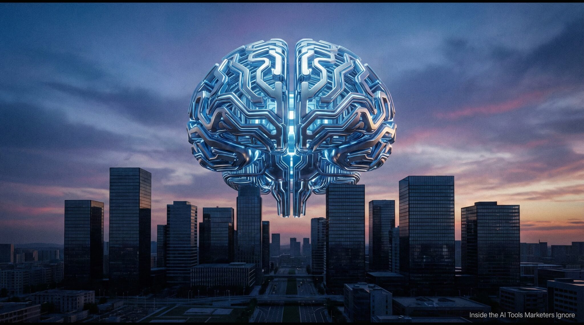 Abstract 3D illustration of a giant neural-circuit brain floating above a modern office skyline at dawn. Composition: symmetrical wide shot with city silhouette at bottom. Lighting: cool-blue ambient glow with metallic highlights. Camera: wide cinematic 16:9 framing. Style: high-detail 3D render with slight film grain. Add small header text: ‘Inside the AI Tools Marketers Ignore’, aligned lower-right with clear legibility.