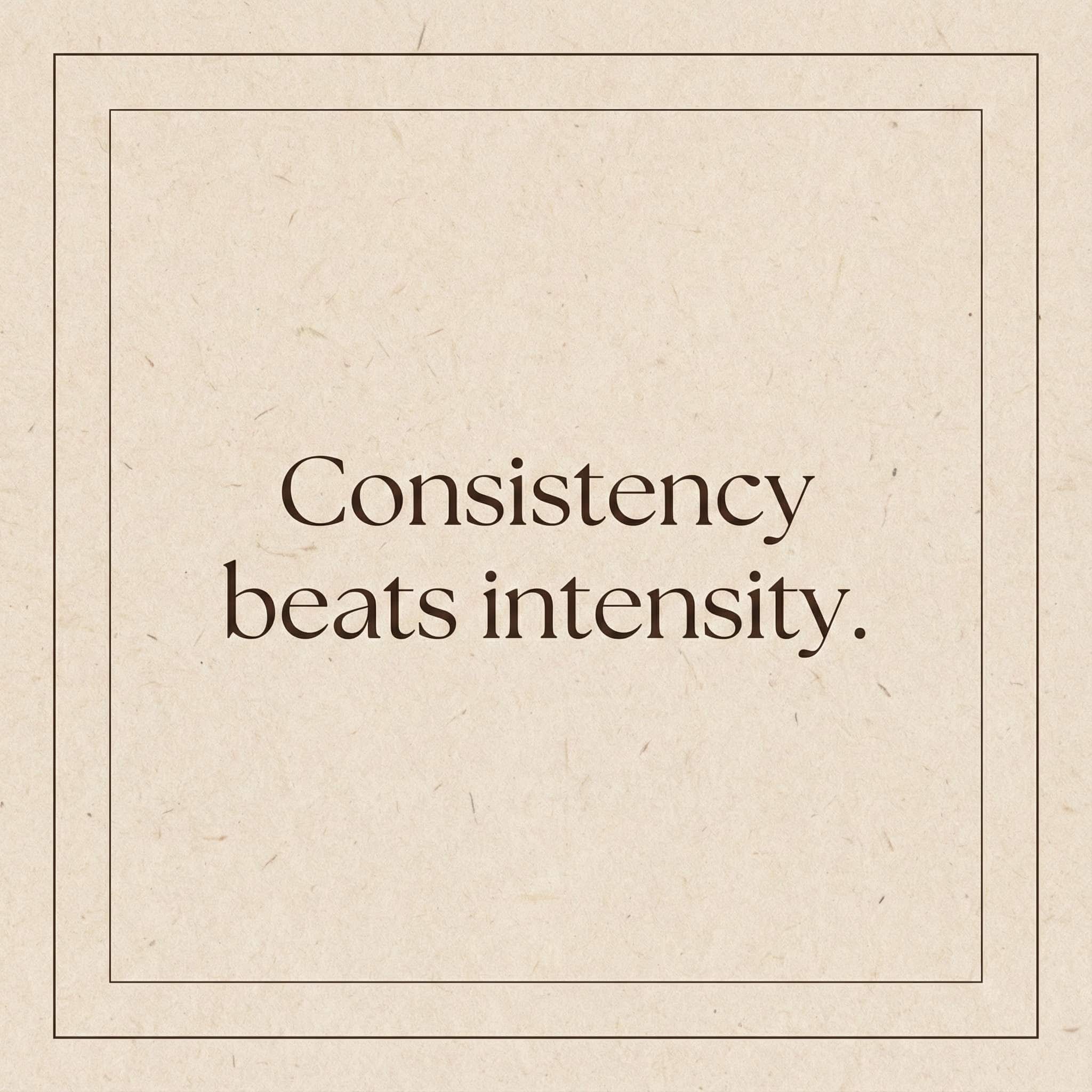 Square Instagram quote graphic with beige background, serif typography, and thin border. Add centred text: “Consistency beats intensity.”