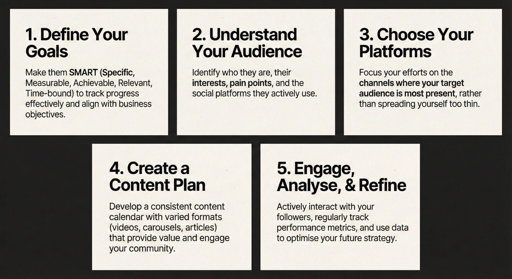 Set of 5 LinkedIn carousel slides with matching style. Clean black text on off-white background, subtle geometric corner shapes, numbered headers.
