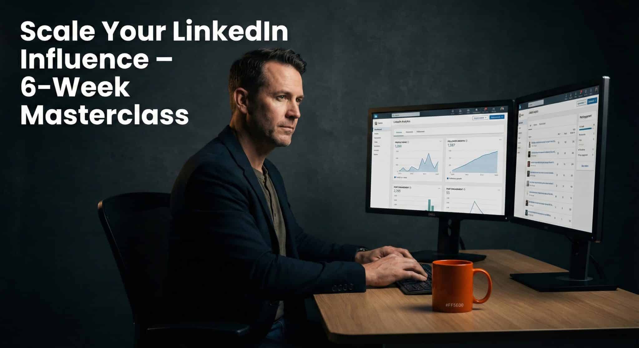 Studio portrait of a male creator (age ~45) seated at a clean desk with two monitors showing LinkedIn analytics dashboards. Composition: subject centered, monitors angled toward camera. Lighting: high-contrast single spotlight with deep shadows. Camera: 50 mm lens, crisp focus. Style: photorealistic, premium tech-ad aesthetic. Branding: orange accent (#FF5E00) on mug. Add overlay text: ‘Scale Your LinkedIn Influence – 6-Week Masterclass’, bold white sans-serif, positioned at top-left with strong legibility.