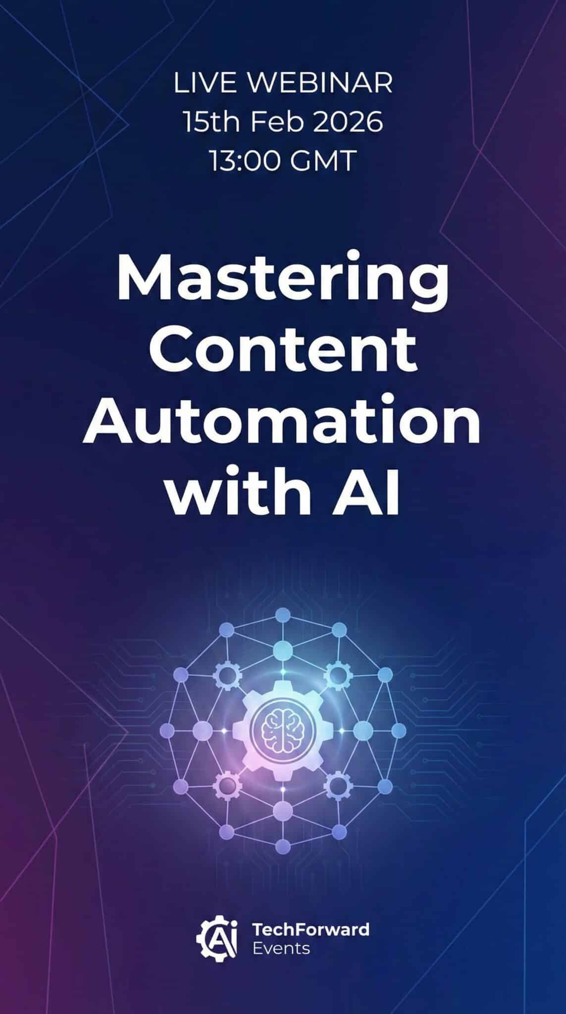 at top, and ‘Mastering Content Automation with AI’ centered in large bold type. Include small logo at bottom.