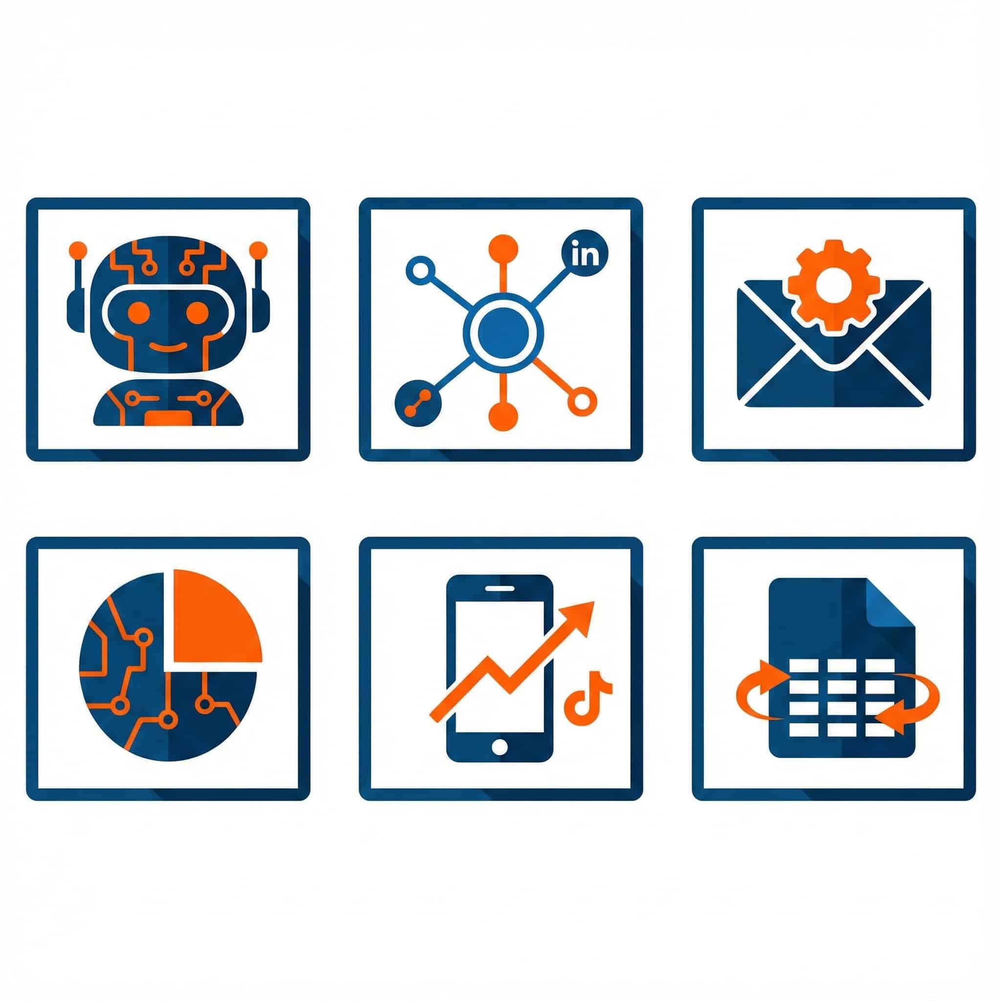 Set of 5 square icons on white: 1) AI assistant, 2) LinkedIn network nodes, 3) Email with gear, 4) TikTok phone + graph, 5) Google Sheets table + automation arrow. Dark blue (#003366) + orange (#FF5E00). Flat design with subtle shadow.