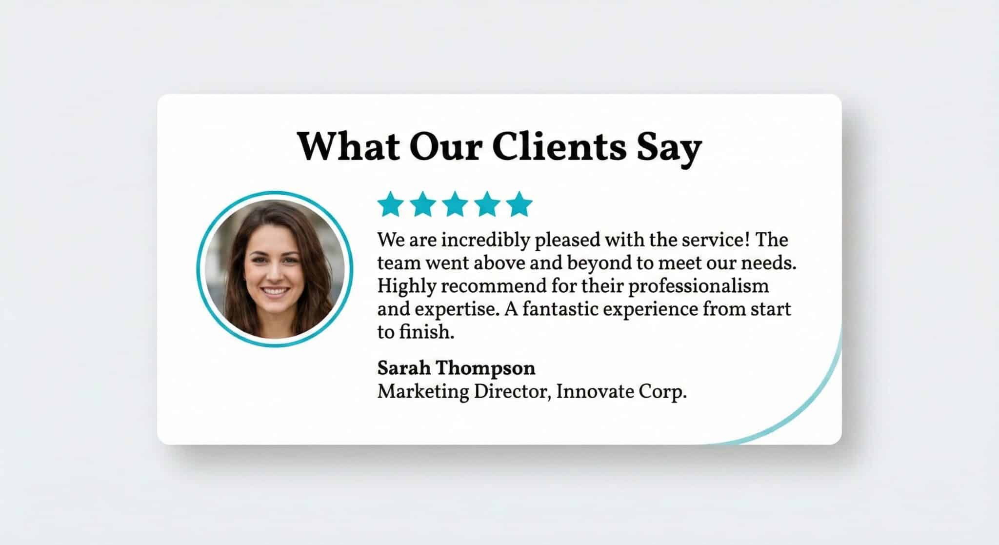 Testimonial card with white background, soft drop shadow, circular profile picture left-aligned, star rating above text. Accent colour: teal (#00B8D9). Font: Vollkorn. Add headline: “What Our Clients Say”.